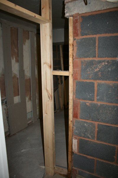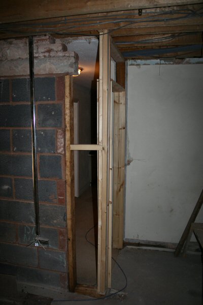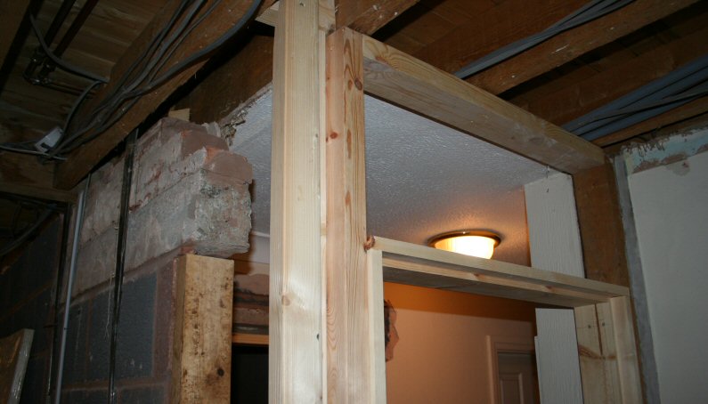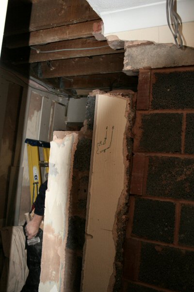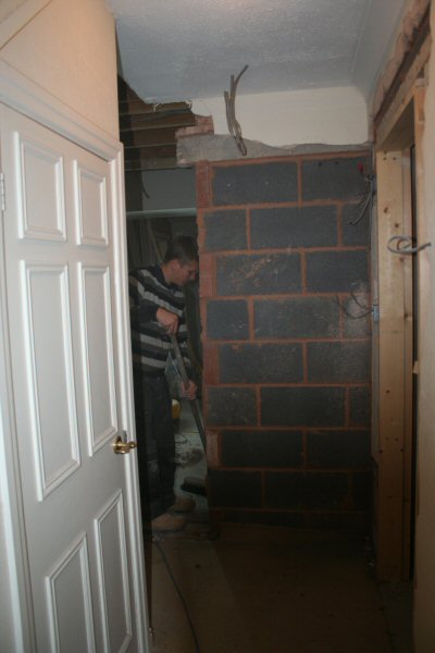 The old doorframe is removed and takes part of the wall with it.